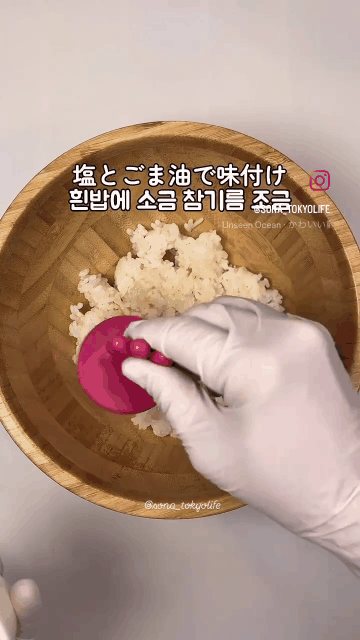 白ご飯に塩とごま油を加え、均一に混ぜます。これが美味しいおにぎりの基本です。
