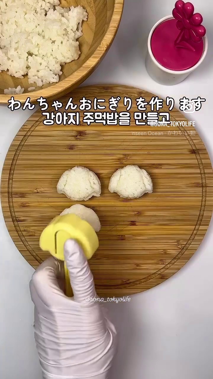 犬の形の型にご飯を詰めて、おにぎりの形を作ります。型がない場合は、手で丸く平らに成形しても大丈夫です。