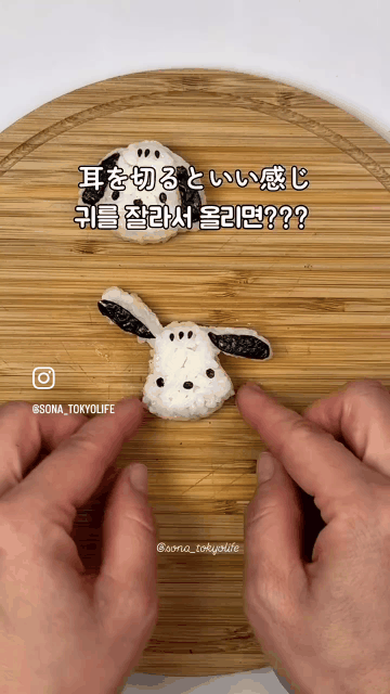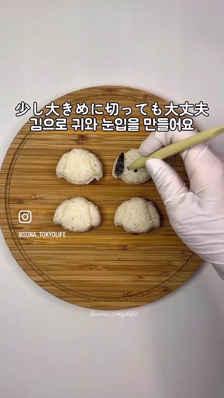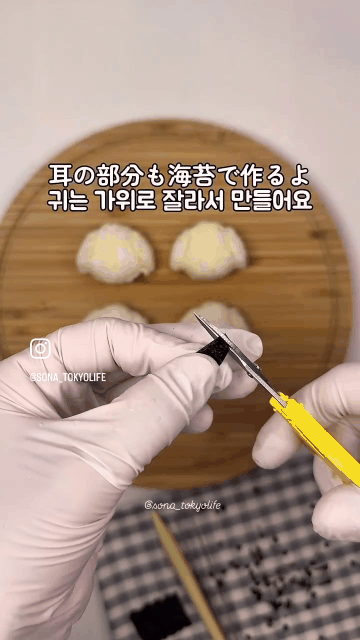 海苔パンチとハサミを使って、耳と目の形を正確に切り出します。耳は少し大きめに切ると良いでしょう。